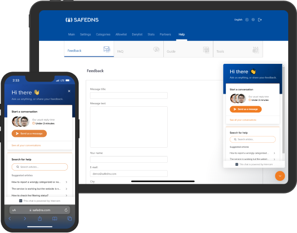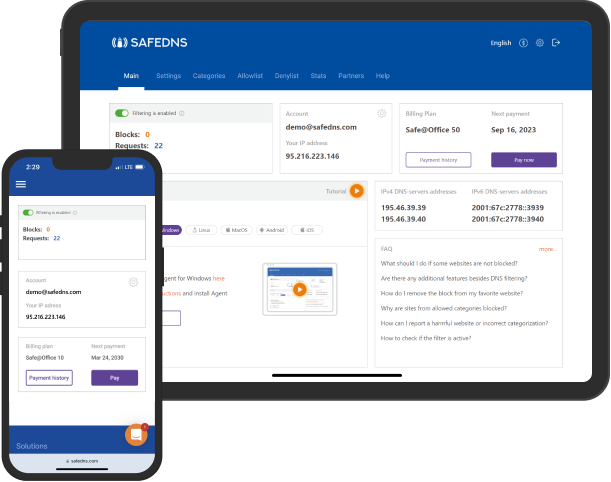 SafeDNS agent is the best tool to start filtering in no time. SafeDNS agents are available on Windows, Linux, MacOS, Android and IOS. Or you can add your IP address in the Settings tab to filter the Internet on a router.